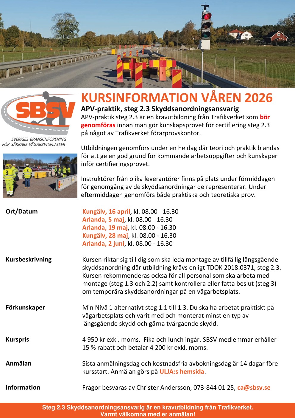 Nu har vi publicerat vårens utbildningstillfälle för APV-praktik steg 2.3 Skyddsanordningsansvarig. Ni kan anmäla er under utbildning. Med vänlig hälsning Sveriges Branschförening för Säkrare Vägarbetsplatser, SBSV