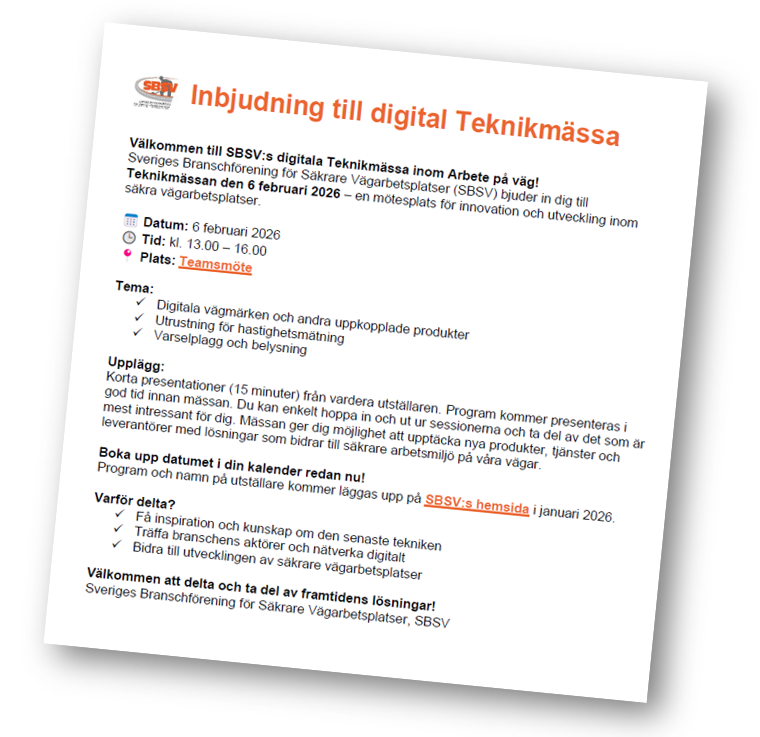 Sveriges Branschförening för Säkrare Vägarbetsplatser (SBSV) bjuder in dig till Teknikmässan den 6 februari 2026 . Program och namn på utställare kommer läggas upp på SBSV:s hemsida i januari 2026.